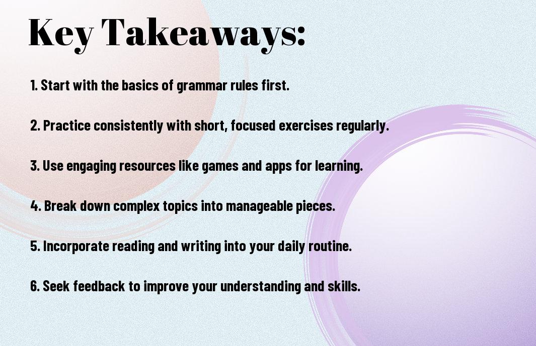 As you initiate on your journey to learn grammar, you may feel overwhelmed by the numerous rules and Exceptions. Your goal is to become proficient, but the task seems daunting. You can start by breaking it down into manageable chunks, focusing on one aspect at a time. For guidance, you can visit tips to Study English Grammar Without Getting Bored and discover ways to make your learning process more enjoyable and effective.
