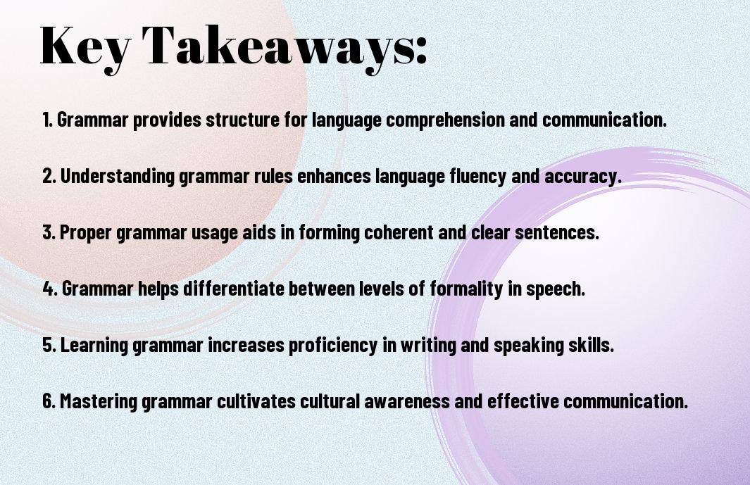 As you strive to become proficient in a language, you will realize that your understanding and use of grammar is vital to effective communication. Your ability to construct sentences, convey meaning, and express yourself accurately depends on your grasp of grammatical rules and principles. You will find that mastering grammar helps you to better comprehend and appreciate the language, enabling you to express your thoughts and ideas with clarity and precision, which is vital for successful communication in both personal and professional settings.
